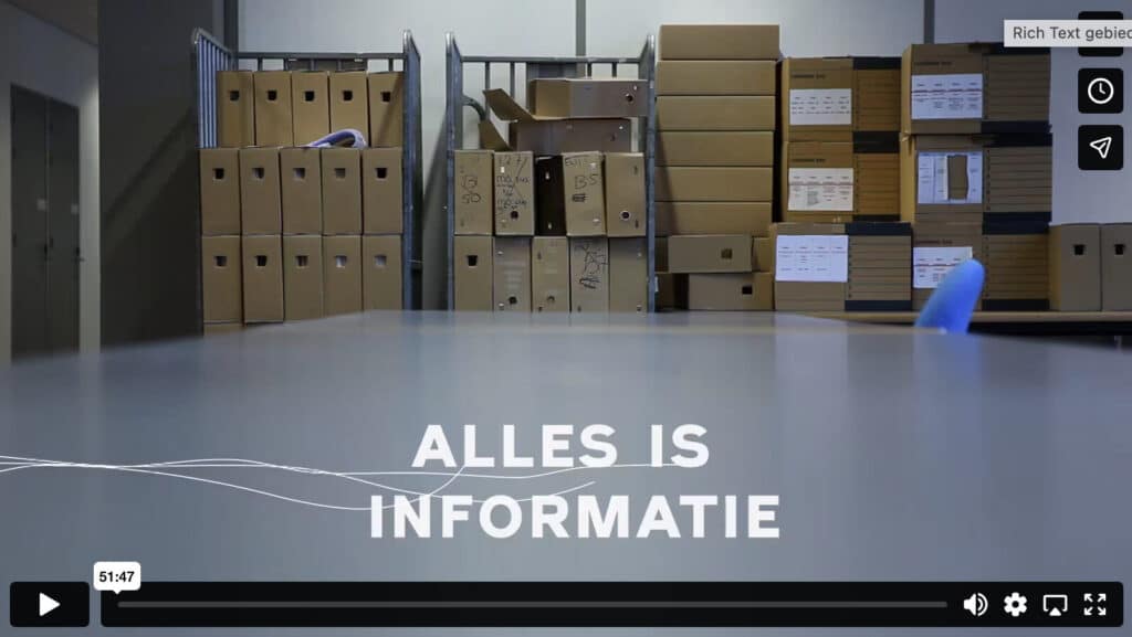 Over de mensen die dagelijks bezig zijn met metadata, structureren van informatie, digitale duurzaamheid, informatiebeveiliging, het leveren van informatiediensten en producten en het digitaliseren van informatie gaat de documentaire ‘Alles is informatie’.